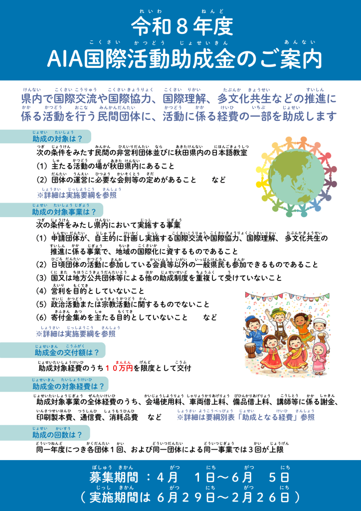 (公財)秋田県国際交流協会では、秋田県内において国際交流や国際協力、国際理解、